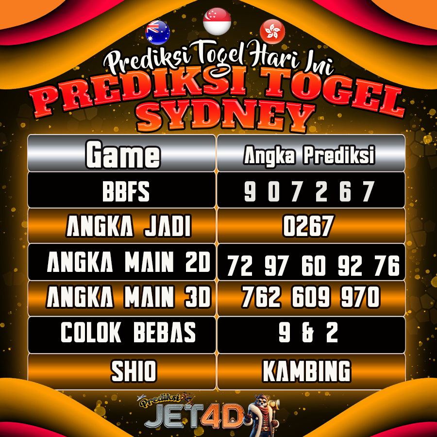 Selamat datang di Jet4d, sobat angka! Seperti biasa, kami hadir kembali dengan prediksi terbaru untuk pasaran Sydney (SDY) hari ini. Prediksi ini dirangkum dari berbagai sumber terpercaya dan analisis rumus terkini. Namun, perlu diingat bahwa ini hanyalah prediksi dan bukan jaminan kemenangan.