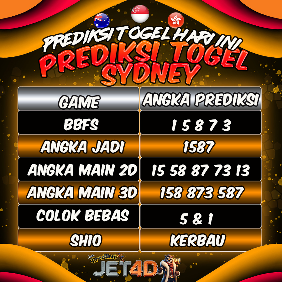 Jet4d Prediksi Togel Sydney untuk hari ini kembali hadir dari Jet4D, memberikan analisis angka yang akurat dan strategi bermain yang tepat. Berdasarkan pola keluaran sebelumnya, statistik harian, serta tren angka terbaru, tim Jet4D telah merumuskan angka potensial yang bisa menjadi referensi para pemain.