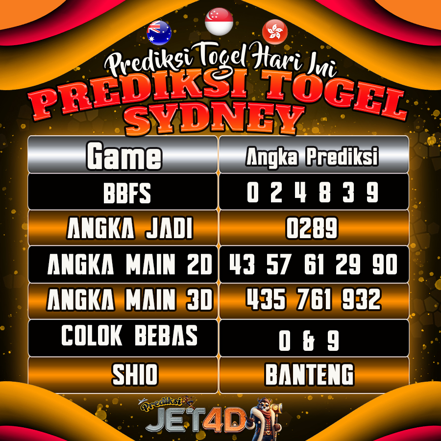 Selamat datang di Jet4d, sobat angka! Seperti biasa, kami hadir kembali dengan prediksi terbaru untuk pasaran Sydney (SDY) hari ini. Prediksi ini dirangkum dari berbagai sumber terpercaya dan analisis rumus terkini. Namun, perlu diingat bahwa ini hanyalah prediksi dan bukan jaminan kemenangan.