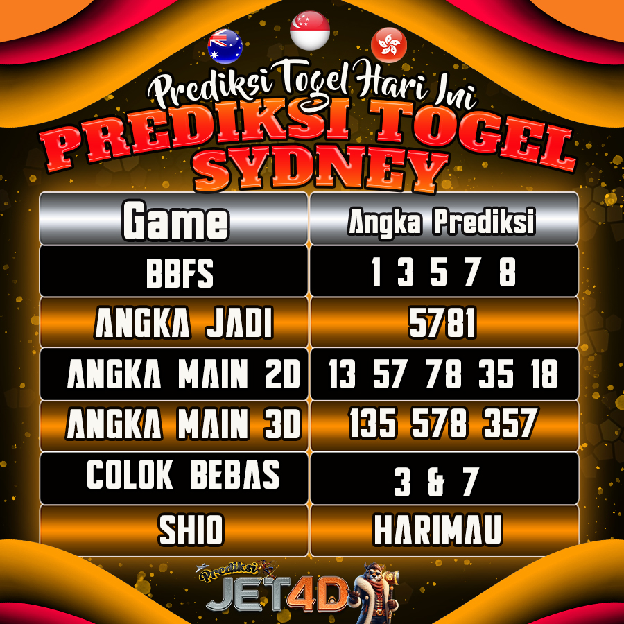 Jet4d Prediksi Togel Sydney untuk hari ini kembali hadir dari Jet4D, memberikan analisis angka yang akurat dan strategi bermain yang tepat. Berdasarkan pola keluaran sebelumnya, statistik harian, serta tren angka terbaru, tim Jet4D telah merumuskan angka potensial yang bisa menjadi referensi para pemain.