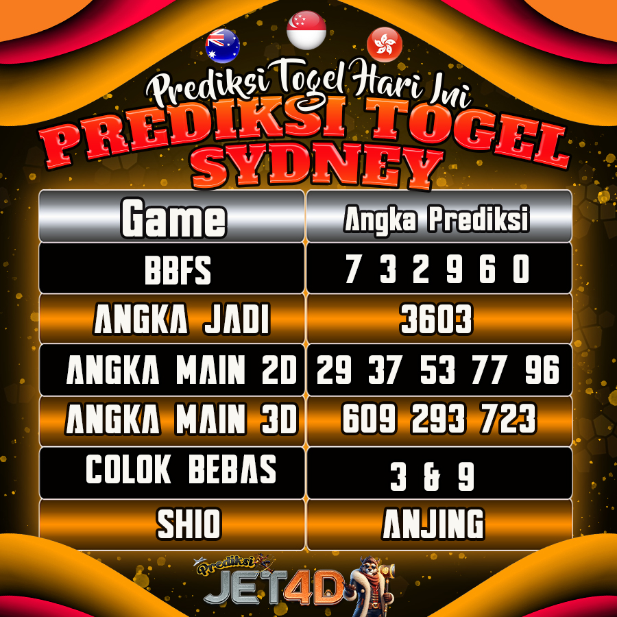 Selamat datang di Jet4d, sobat angka! Seperti biasa, kami hadir kembali dengan prediksi terbaru untuk pasaran Sydney (SDY) hari ini. Prediksi ini dirangkum dari berbagai sumber terpercaya dan analisis rumus terkini. Namun, perlu diingat bahwa ini hanyalah prediksi dan bukan jaminan kemenangan.