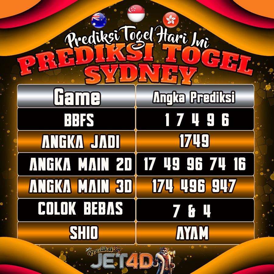 Jet4d Prediksi Togel Sydney untuk hari ini kembali hadir dari Jet4D, memberikan analisis angka yang akurat dan strategi bermain yang tepat. Berdasarkan pola keluaran sebelumnya, statistik harian, serta tren angka terbaru, tim Jet4D telah merumuskan angka potensial yang bisa menjadi referensi para pemain.