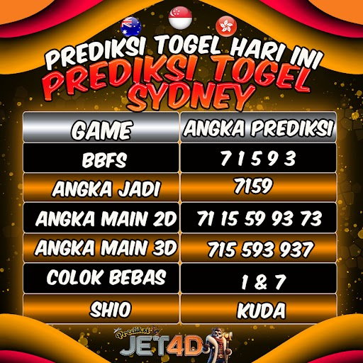 Jet4d Prediksi Togel Sydney untuk hari ini kembali hadir dari Jet4D, memberikan analisis angka yang akurat dan strategi bermain yang tepat. Berdasarkan pola keluaran sebelumnya, statistik harian, serta tren angka terbaru, tim Jet4D telah merumuskan angka potensial yang bisa menjadi referensi para pemain.